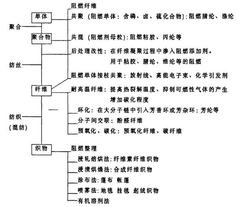 纺织品的阻燃按除了单体和聚合物之外,通常按照生产过程及阻燃剂的引入方法大致分为纤维的阻燃处理和织物的阻燃整理两类。